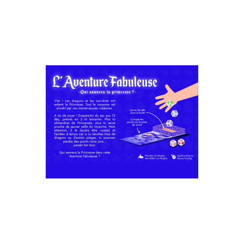 Les faces des dés offrent différentes possibilités stratégiques, telles que les princesses à collecter, les boucliers protecteurs, les épées permettant de rejouer, les dragons redoutables, les explosions dévastatrices, les chevaliers pour éliminer les dragons et la sorcière pour contrarier les adversaires. L’Aventure Fabuleuse est un excellent jeu pour jouer en famille ou entre amis autour d’une table. Pour découvrir le jeu en détails, les règles de jeu sont disponibles en version française.