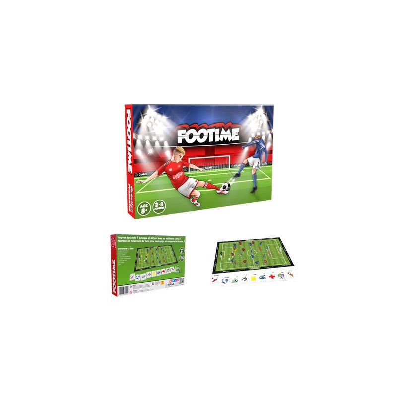 Chaque joueur compose son équipe, puis enchaîne les tours en jouant une carte de chaque couleur parmi les six qu’il a en main. Ces cartes permettent de réaliser des actions clés : déplacements avec ou sans ballon, passes, tirs, parades défensives, mais aussi tactiques spéciales ou décisions arbitrales qui viendront bousculer le cours du match. Grâce à une mécanique fluide et rythmée, les joueurs doivent faire preuve de stratégie, d’anticipation et de réactivité pour marquer plus de buts que leurs adversaires avant la fin du temps réglementaire. FOOTIME se distingue par son thème universel, ses règles simples dès 8 ans, sa forte rejouabilité et ses parties courtes de 15 à 20 minutes.