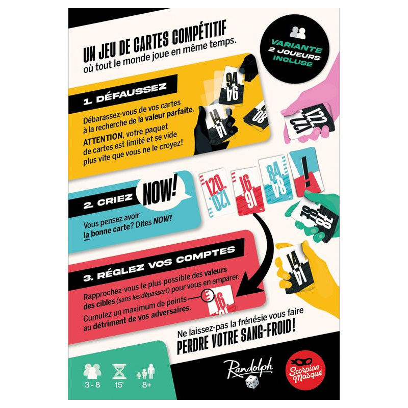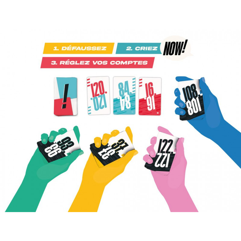 Un jeu compétitif où tout le monde joue en même temps ! Défaussez vos cartes le plus vite possible à la recherche de la valeur parfaite. Attention, votre paquet se vide plus vite que prévu ! Vous pensez avoir la bonne carte ? Criez NOW! Ne laissez pas la frénésie vous faire perdre votre sang-froid.