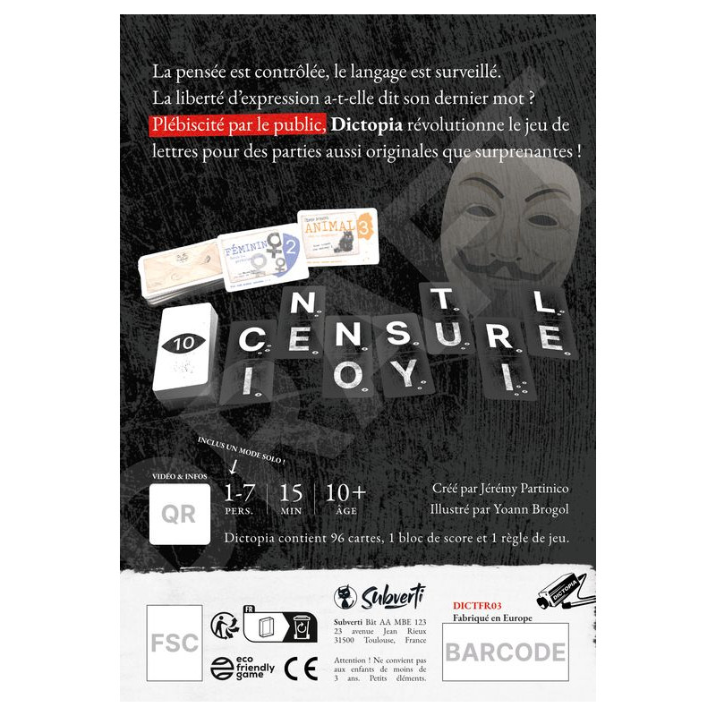 Rapide et tactique, Dictopia révolutionne le jeu de lettres. Prouvez votre capacité à échapper à la censure et tentez de rejoindre la Résistance en passant cinq épreuves d’une minute et trente secondes pendant lesquelles tout le monde joue en même temps.