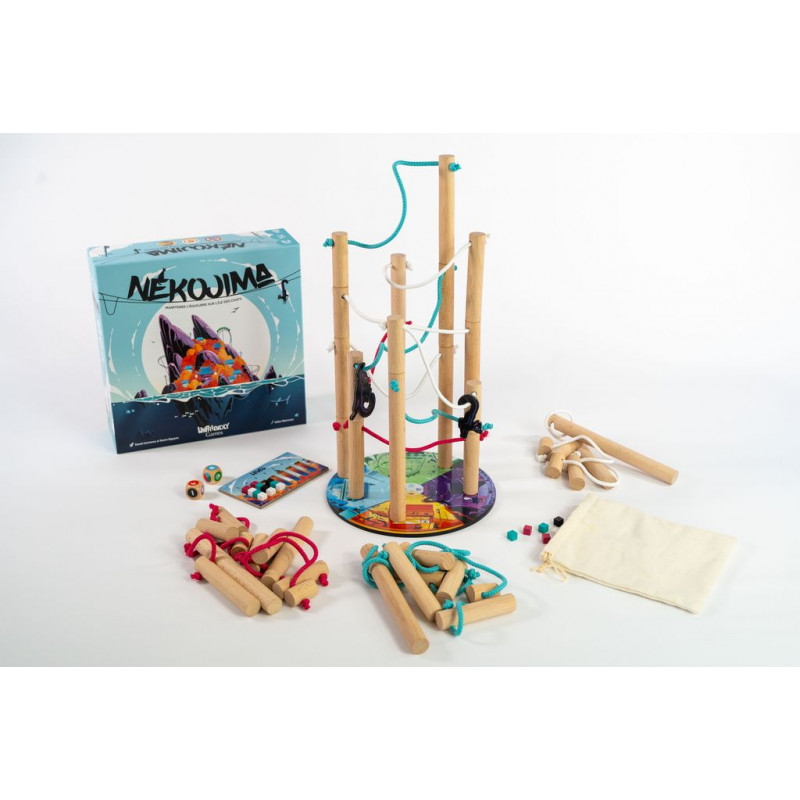Nekojima est un jeu d’adresse en bois dans lequel il faudra maintenir en équilibre des poteaux électriques en respectant les emplacements sans qu’aucun câble ne se touche. En compétition, le joueur qui fait tomber la structure a perdu. En coopération, le but est d’aller le plus loin possible.