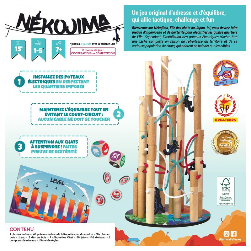 Il convient aussi bien à un enfant s’initiant avec l’équilibre à un profil expert en dextérité. Les différentes variantes de jeu (Expert, Gratte-ciels, Jungle Urbaine et Duo) innovent les façons de jouer à Nekojima et permettent d'apporter une difficulté supplémentaire.