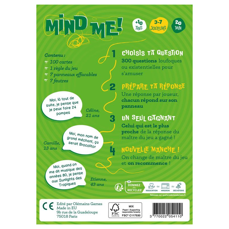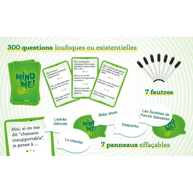 Mind Me comporte 300 questions, 7 stylos et 7 ardoises effaçables.