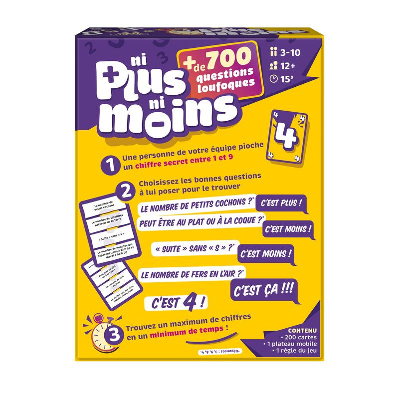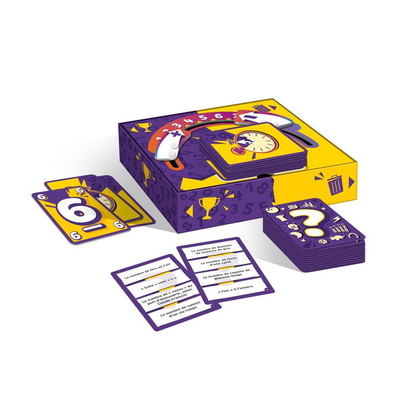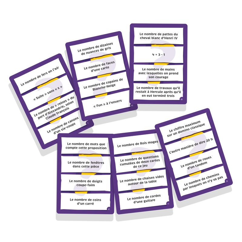 Vous devez découvrir le chiffre entre 1 et 9 qu’une personne de votre équipe a pioché. Vous lui posez des questions pour éliminer les chiffres possibles petit à petit, jusqu’à tomber sur la bonne valeur. Découvrez toutes les cartes Chiffre en jeu le plus vite possible !