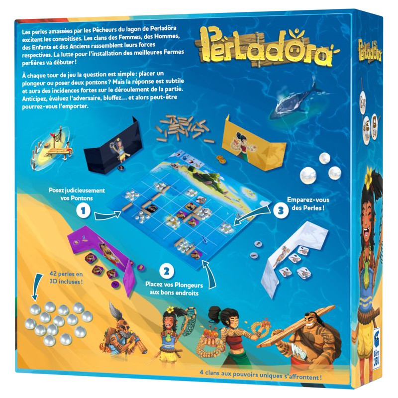 Afin de gagner les Perles, délimitez des territoires en posant des Pontons et placez vos Plongeurs pour y devenir majoritaire. À chaque tour de jeu la question est simple : placer un Plongeur ou poser deux Pontons ?