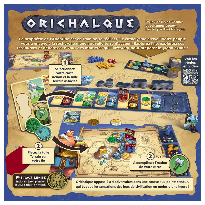Construisez des Temples, forgez des médaillons d'Orichalque et attirez l'attention des Titans pour obtenir 5 points de victoire en premier, et remporter la partie ! Il vous faudra explorer l'île, produire des ressources, développer votre camp de base et affronter les créatures qui peuplent l'île.