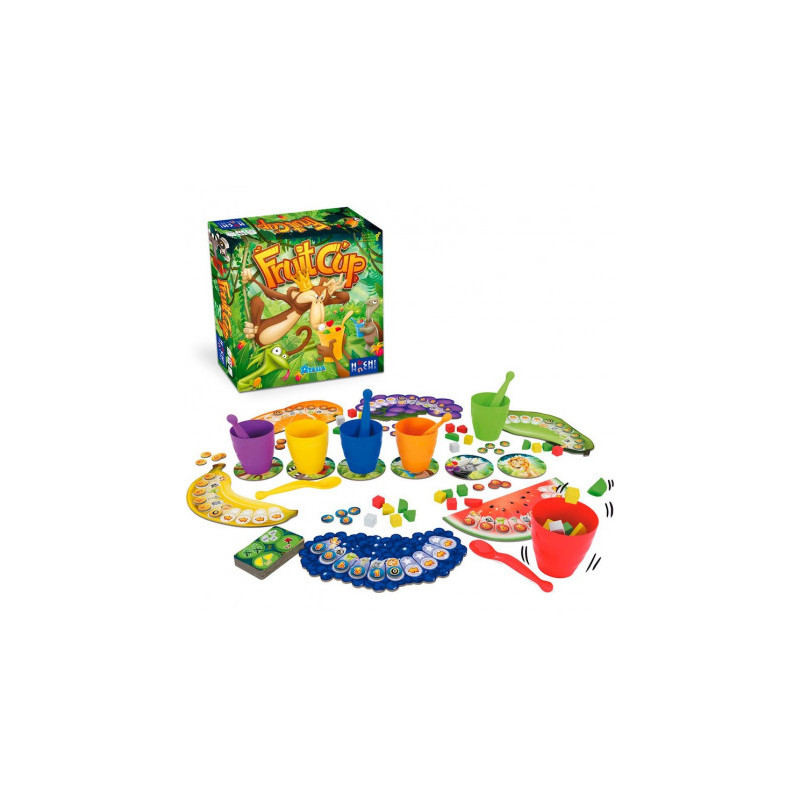 Découvrez vite "Fruit Cup", un jeu familial où vous devenez chef cuisinier préparant des salades de fruits selon les caprices du roi. En alliant observation, rapidité, réflexion, et dextérité, chaque joueur tente de satisfaire les cartes objectifs. Avec des gobelets colorés, des cuillères, et des cartes de recettes, ce jeu divertissant ravit les joueurs de tous les âges.