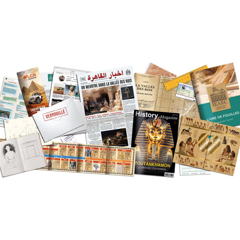 Ce dossier criminel contient tous les éléments pour résoudre ce meurtre. Un guide des fouilles, des transparents de la vallée des rois, des papyrus, un article de presse, des croquis, des contenus audio… etc.