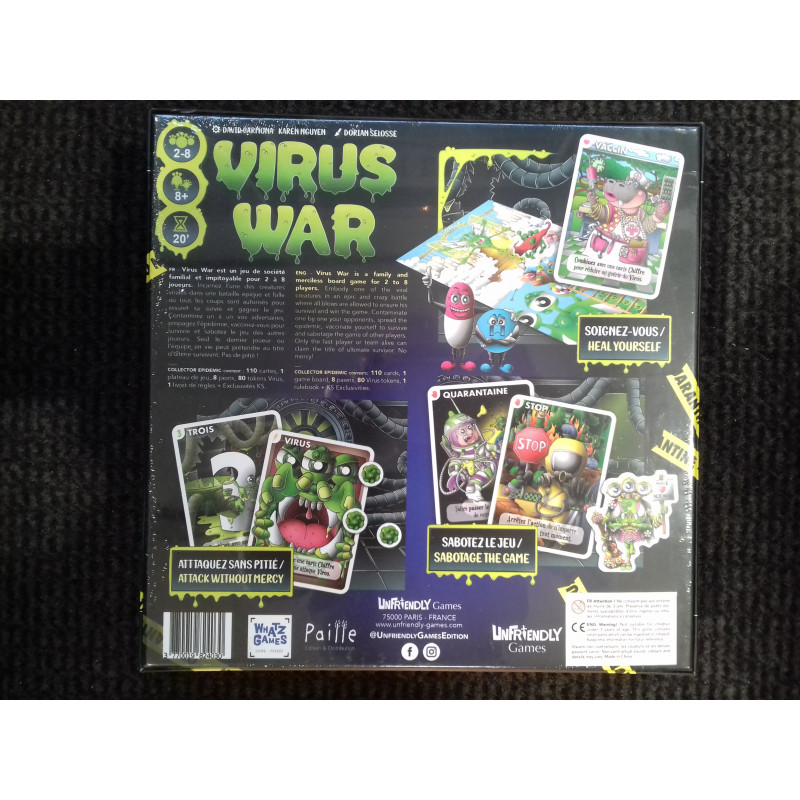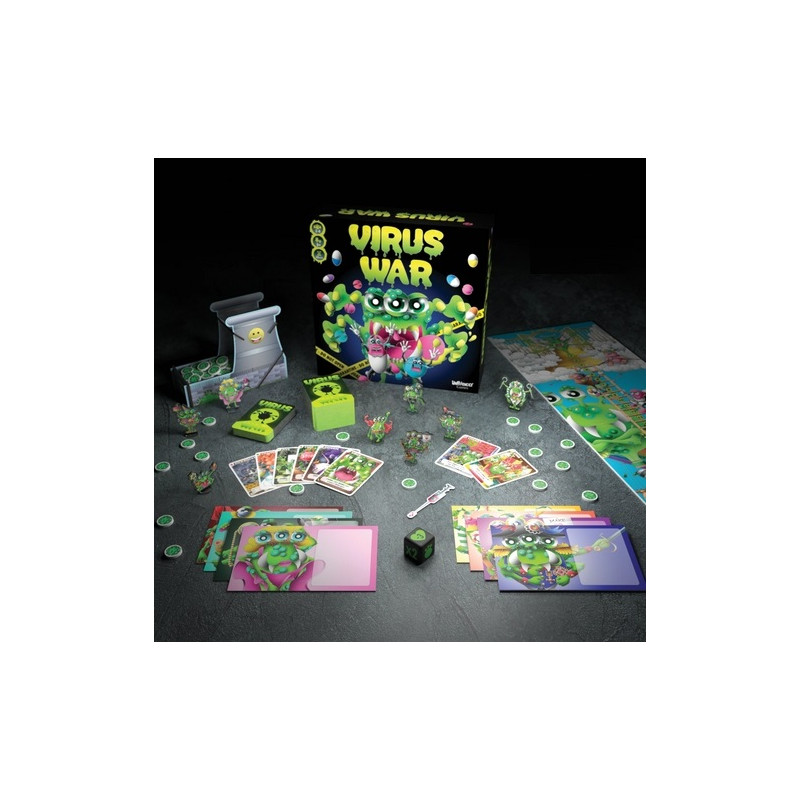 Virus War est un jeu de société familial et hilarant pour 2 à 8 joueurs. Incarnez l’une des personnalités virales dans une bataille épique et folle où tous les coups sont autorisés pour assurer sa survie et gagner le jeu. Contaminez un à un vos adversaires, propagez l’épidémie, vaccinez-vous pour survivre ou sabotez le jeu des joueurs. Seul le dernier joueur ou l’équipe en vie peut revendiquer le titre de survivant. Pas de pitié !
