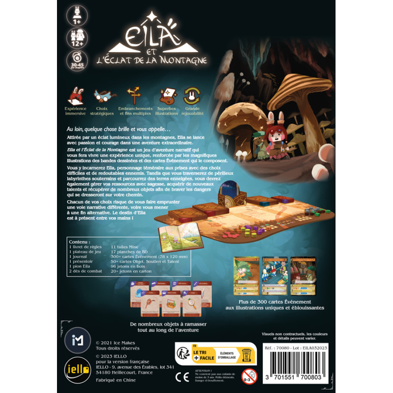contenu : 1 plateau de jeu, 1 journal, 2 dés de combat, 1 pion Eila, 1 présentoir, 11 tuiles Mine, 32 cartes Objet, 14 cartes Soutien, 7 cartes Talent, 22 cartes Évènement avancé, 6 paquets de cartes Évènement de base, 17 planches de Bandes dessinées, 18 jetons Nourriture, 18 jetons Pièce, 18 jetons Connaissance, 18 jetons Énergie, 16 jetons Peur, 8 jetons Pierre magique, 12 jetons Cœur, 12 jetons Cache 1 Règle du jeu.