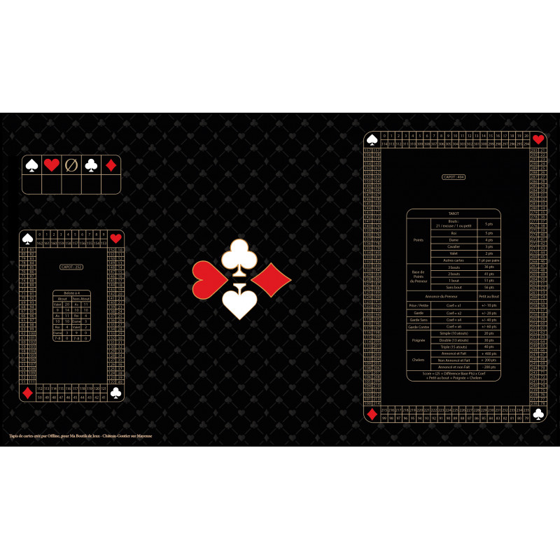 Présents sur le tapis : tableau de score belote à 4 et belote à 6, tableau de rappel de l'atout, tableau spécial Tarot et le rappel des valeurs pour la belote.