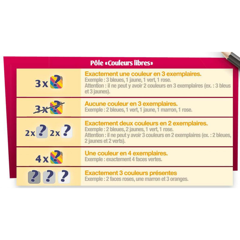 Contenu : 6 dés colorés, 1 bloc papier, 1 règle du jeu.