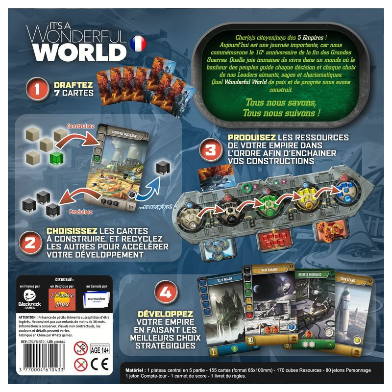 It’s a Wonderful World est un jeu de draft de cartes et de moteur de ressources. Développez votre Empire en combinant de multiples stratégies ! Une partie se déroule en 4 manches.
