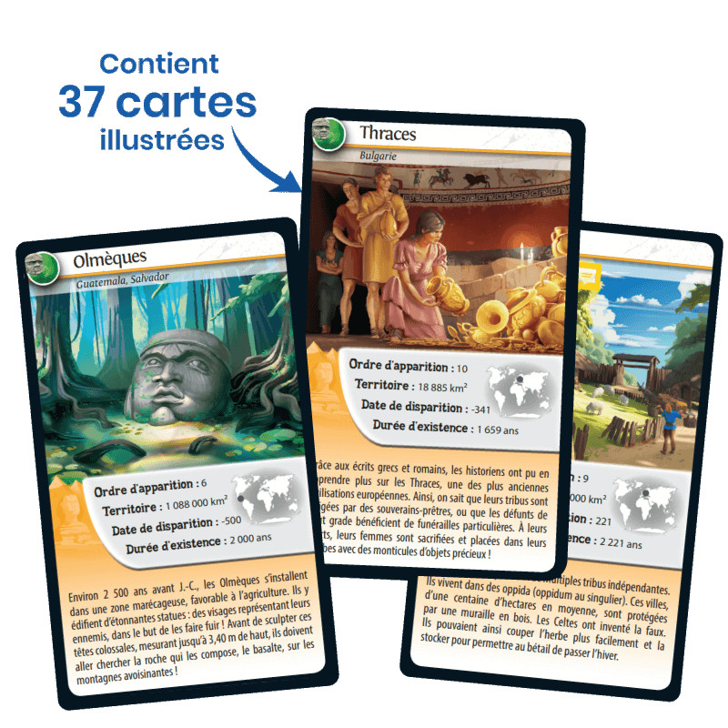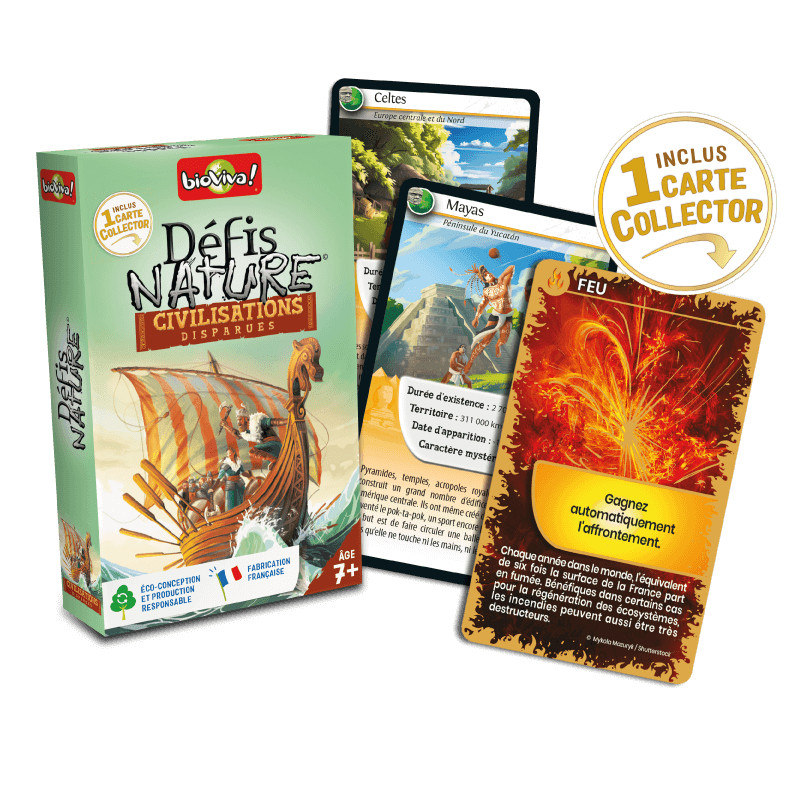 Défis Nature - Civilisations disparues vous emmène à la rencontre des civilisations disparues du monde entier ! Découvrez les civilisations, puis pariez sur les points forts de vos civilisations pour collecter toutes les cartes du jeu et remporter la partie. Alors, prêts à relever le défi ?