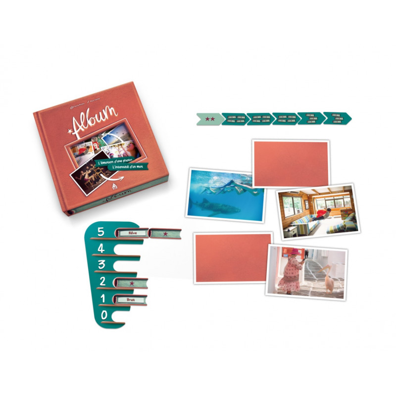 Parmi 5 photos, une seule doit rester visible en fin de manche. Pour vous aider, des mots sont placés sur une échelle d'intensité, tels de subjectifs indices. Album est un jeu coopératif où l'échange et l'écoute des points de vue sont les clés de la réussite.
