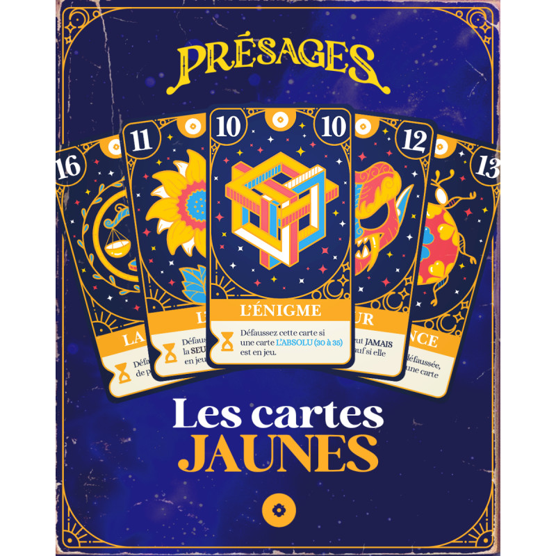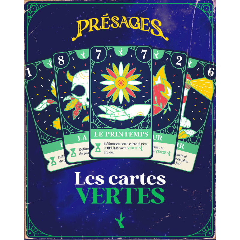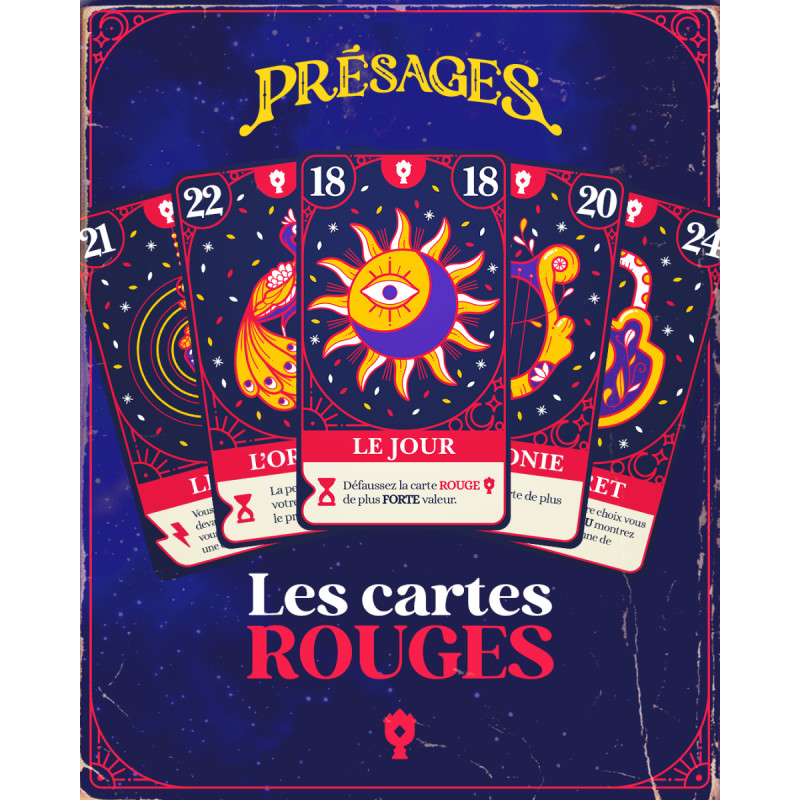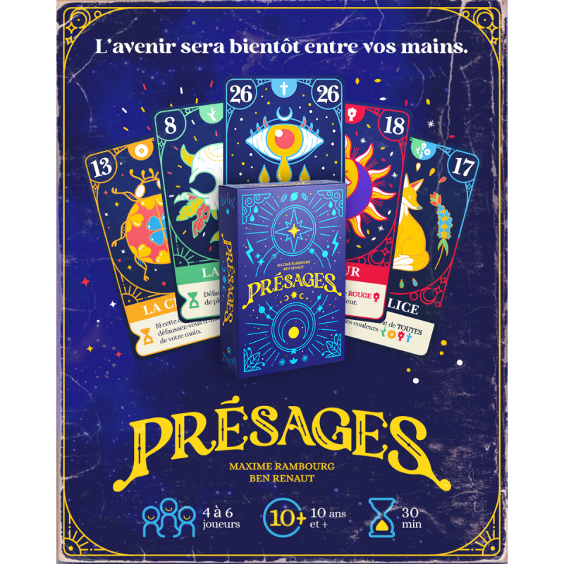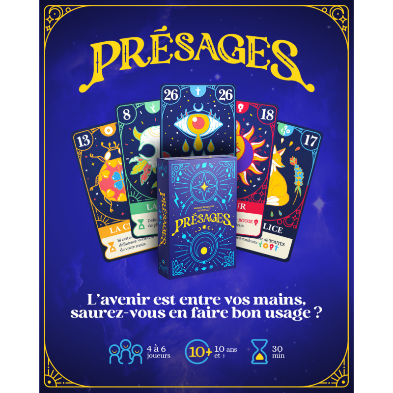 Présages est un jeu de défausse fort en émotions et en rebondissements, qui se joue en équipes, quelque soit la configuration. C'est un jeu dans lequel on assiste à de vrais coups d'éclats, grâce à sa mécanique centrale de cartes à effets toutes uniques Chaque personne autour de la table va essayer de jouer ses cartes au mieux pour avantager au maximum son partenaire ou contrer l'équipe adverse. Avec une vraie tension au fur et à mesure que la partie avance puisque c'est aussi une course à la première personne qui se débarrassera de toutes ses cartes sauf une.