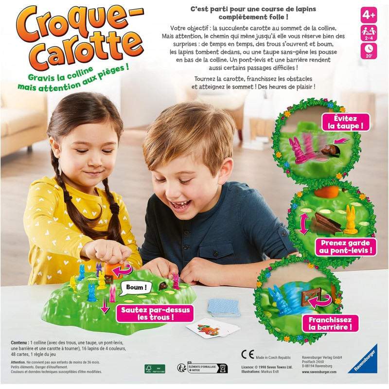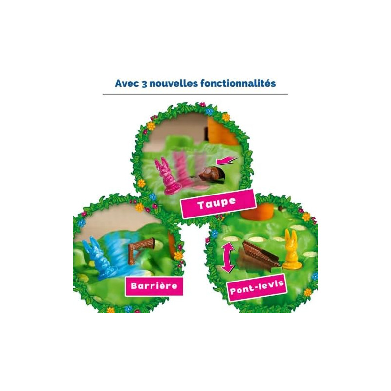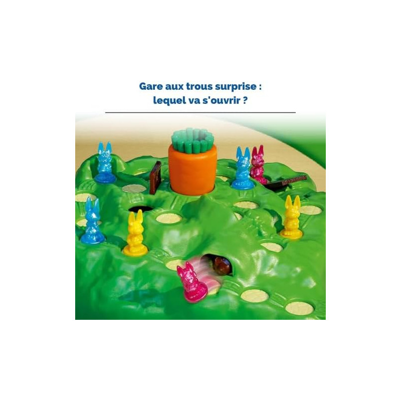 C'est parti pour une course de lapins complètement folle ! Ton objectif : la succulente carotte au sommet de la colline. Mais attention, le chemin qui mène jusqu'à elle est plein de surprises : de temps en temps, des trous s'ouvrent et boum, les lapins tombent dedans, ou une taupe sans-gêne les pousse sur le côté. Un pont-levis et une clôture peuvent aussi gêner le passage. Quel petit lapin atteindra le premier la carotte ? En bonus : inclus un jeu de cartes inédit !