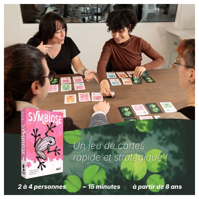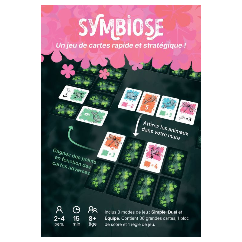 Symbiose est un jeu de cartes original favorisant l'interaction entre les joueuses et joueurs grâce à son système de points dépendant des cartes adverses. Avec 3 modes de jeu aux sensations variées, des règles simples et accessibles, un design graphique soigné et des parties rapides, il est parfait pour tous les publics. L'originalité, la diversité, la simplicité, l'esthétique et la rapidité réunies pour une expérience ludique unique !