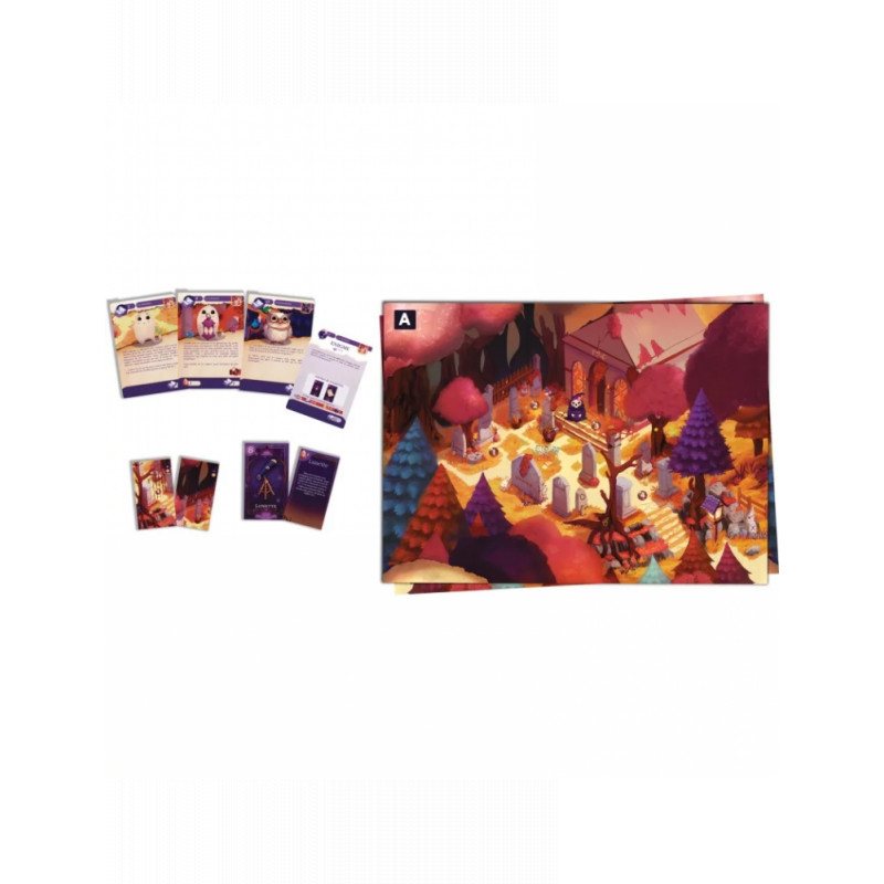 9 plateaux Lieu, 213 cartes narratives, 32 cartes événements, 11 cartes Artefact, 2 pions en bois, 16 jetons en bois, 2 livrets de règles.