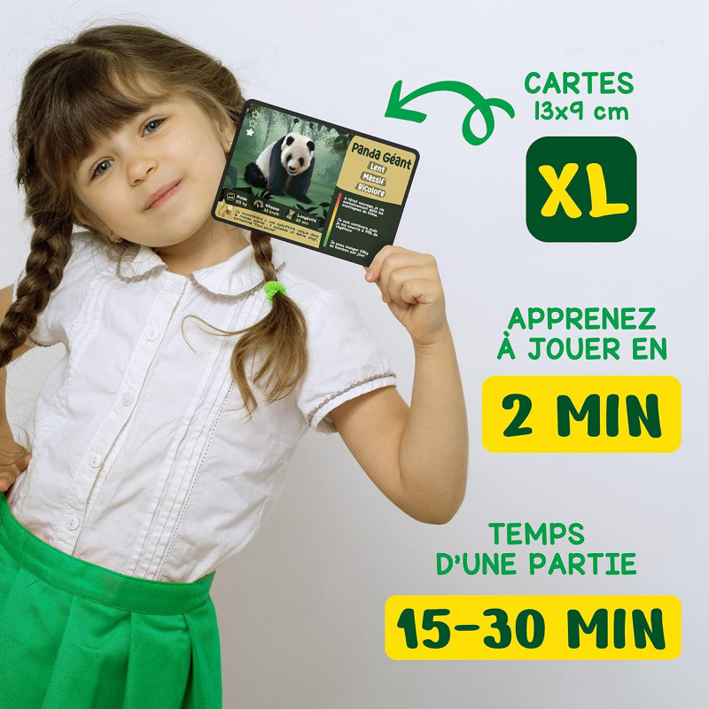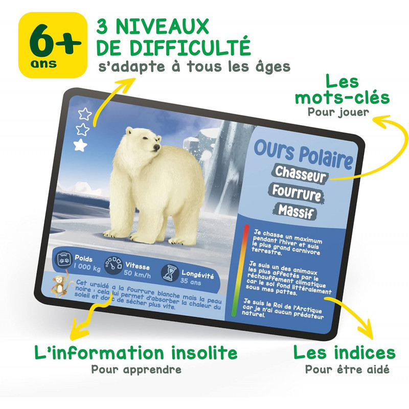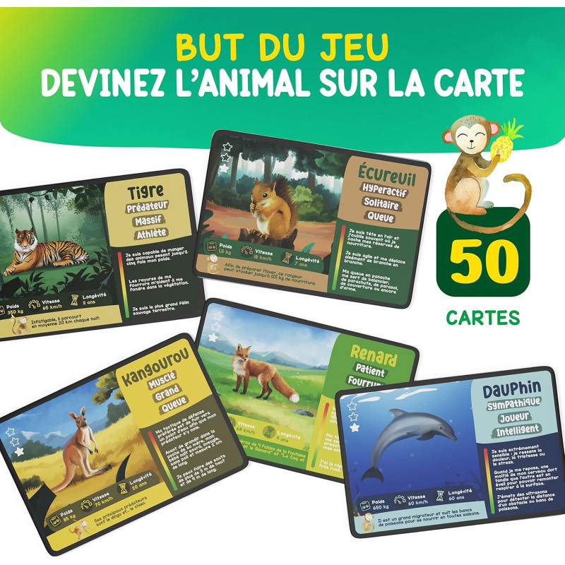 Le jeu est composé de 49 cartes animaux à deviner, une carte plateau et un pion. Chaque carte animal comporte des informations sur l’animal : 3 mots clés, 3 indices de difficulté décroissante ,les informations sur la vitesse, le poids et la longévité de l’animal ,une information insolite sur l’animal.