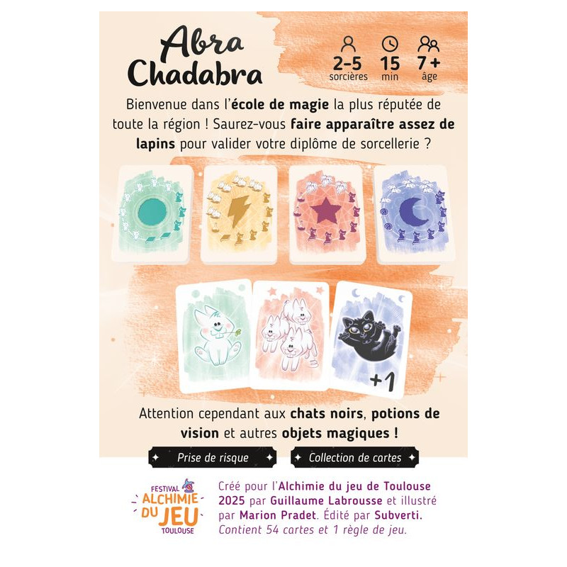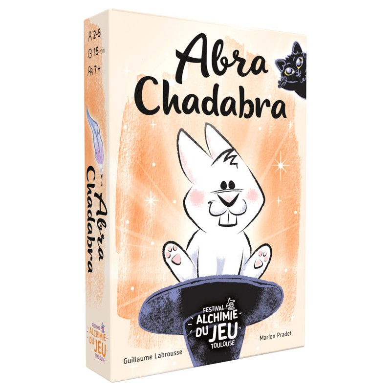 Abra Chadabra est un jeu de cartes familial où vous allez devoir prendre tous les risques pour obtenir votre diplôme de sorcellerie. Faites apparaître des lapins en choisissant la bonne carte parmi les 4 paquets classés de facile à chaotique. Mais attention aux chats noirs, potions de vision et autres objets magiques. Avec une mécanique simple et efficace accompagnée d'illustrations adorables, les parties s'enchaînent facilement pour le plus grand amusement de toutes et tous !