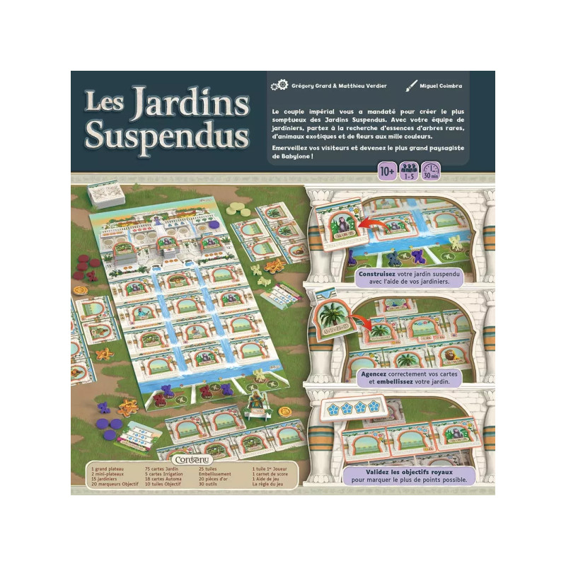 Vous incarnez un paysagiste chargé par le roi de Babylone Nabuchodonosor II d’aménager les jardins suspendus pour la reine Amytis. Au cours des 4 manches de la partie, vous devez utiliser au mieux votre équipe de jardiniers pour réaliser le jardin suspendu qui plaira le plus au couple royal, c’est-à-dire en marquant plus de points de victoire que vos adversaires.