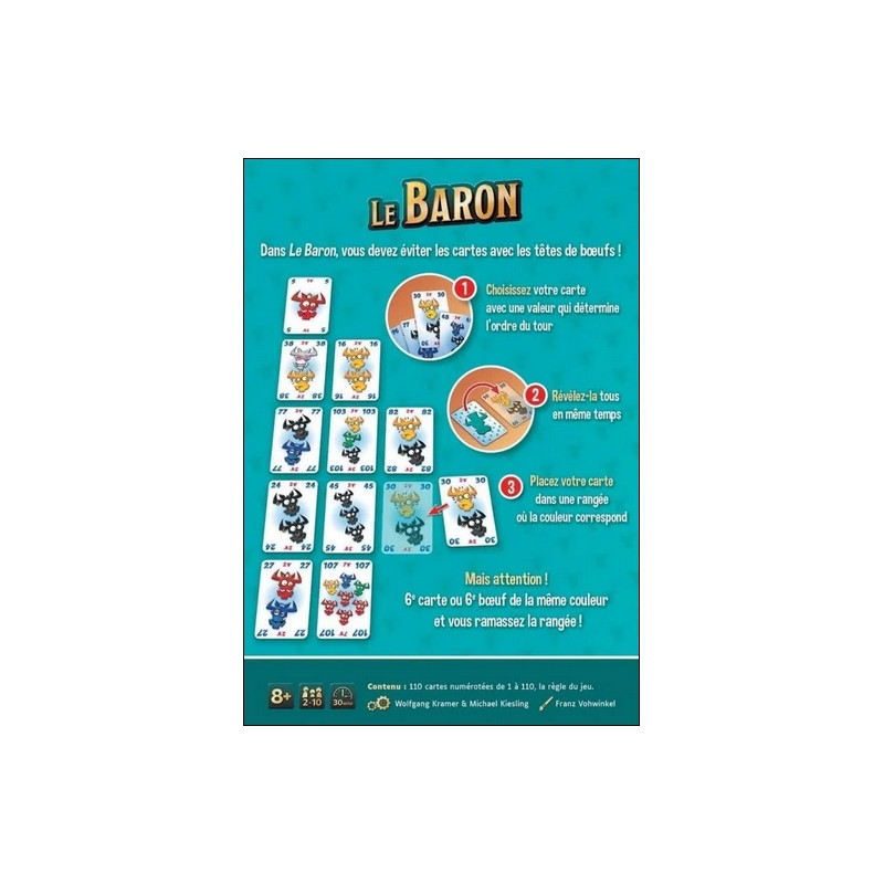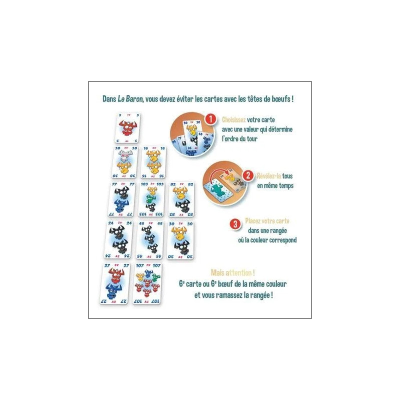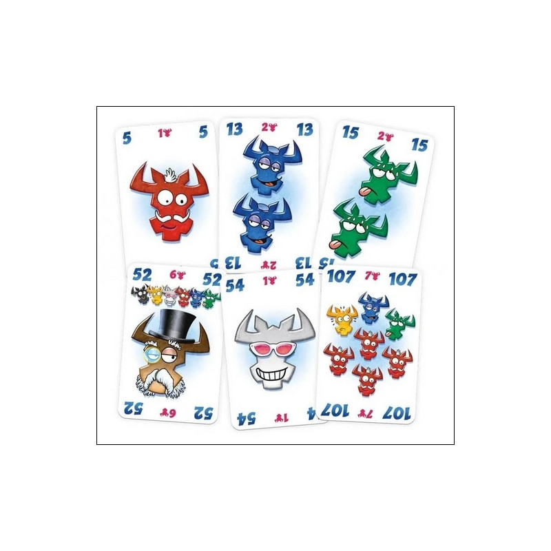 Posez vos cartes dans une des 5 rangées en respectant les couleurs des têtes de bœuf disponibles. Mais attention : si vous posez la 6e carte ou la 6e tête de bœuf de la même couleur d’une rangée, vous devez ramasser les cartes ! Vous récupérez ainsi des points négatifs. Alors arrangez-vous plutôt pour forcer vos adversaires à les ramasser et ainsi peut-être remporter la victoire !