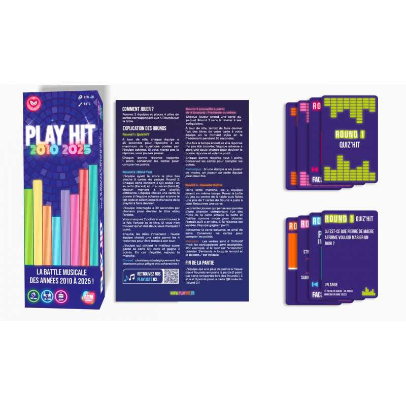 En 4 manches, affrontez-vous en équipe et répondez à un maximum de questions sur les hits français et internationaux des années 2010 et 2025. Play Hit 2010-2025 reprend les codes qui ont fait le succès de Play Hit avec son format en 4 manches, cette fois en se portant sur les tubes de 2010 à 2025.