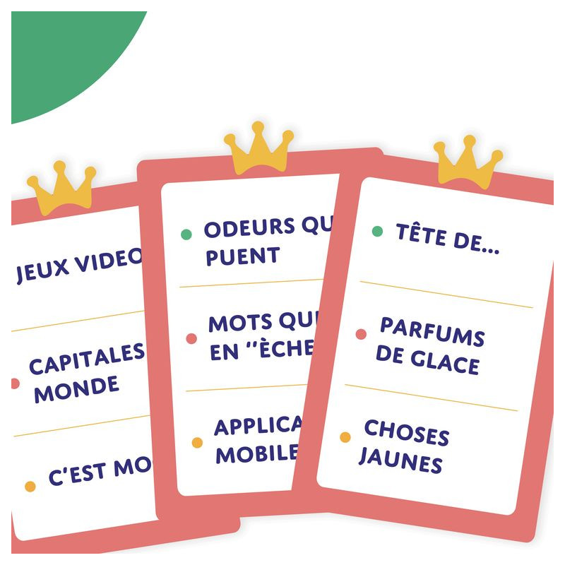 Être le 1ᵉʳ à se débarrasser de toutes ses cartes ! Les règles du jeu sont simples : une liste est choisie, chacun votre tour, débarrassez-vous de votre main en proposant des réponses qui commencent par les lettres de vos cartes. Exemple : "parfums de glace" Carte A pour Abricot, C pour Chocolat