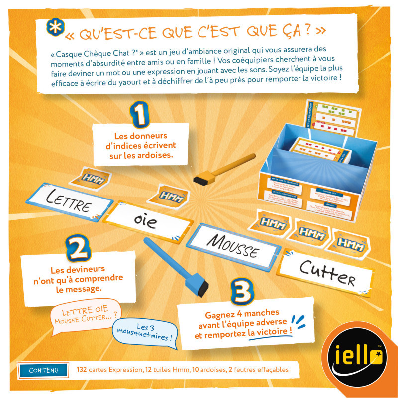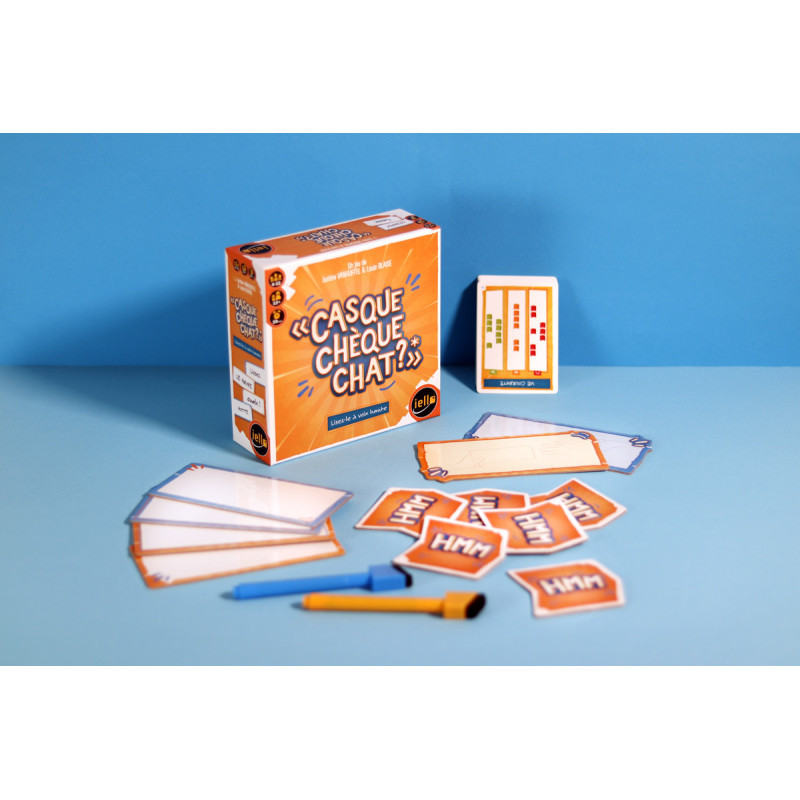 Casque Chèque Chat ? est un party game aussi original qu'efficace, basé sur la phonétique. Proposé dans un format accessible, il s’adresse à un public large et permet de générer facilement des moments très conviviaux. Dans ce jeu d’ambiance totalement décalé, les joueurs doivent faire deviner des expressions, titres de films ou de chansons à partir de mots qui n’ont aucun rapport… sauf phonétique. Le résultat ? Des fous rires garantis et une expérience de jeu unique, parfaite pour les soirées entre amis ou en famille.
