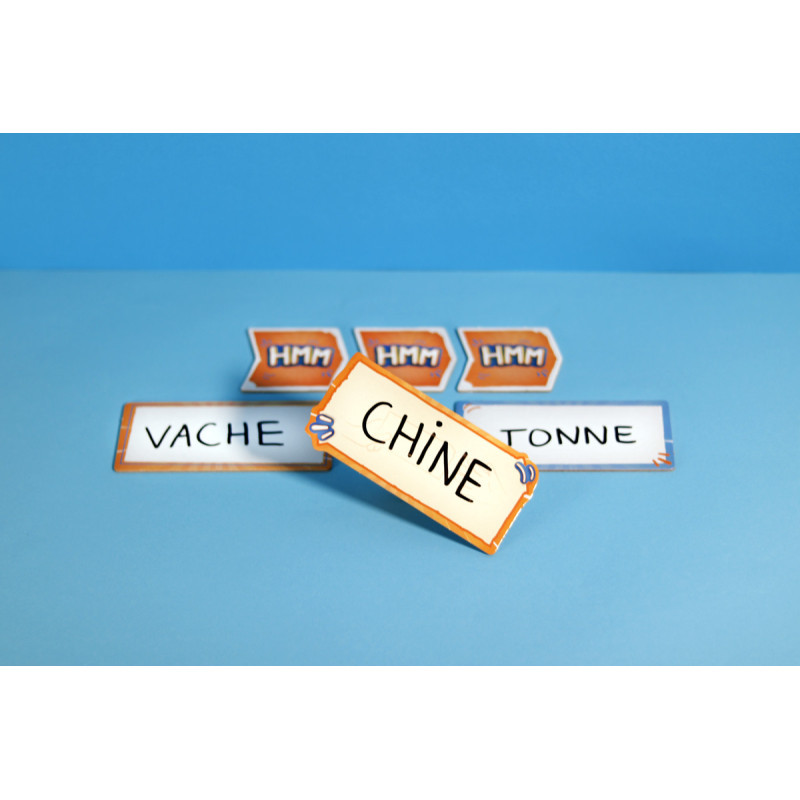 Les donneurs d’indices écrivent ensuite des mots phonétiquement proches de l’expression à deviner, mais sans aucun lien de sens ou d’orthographe. Par exemple, pour faire deviner Ali Baba et les Quarante Voleurs, un joueur pourrait écrire Blabla pour Baba et Handballeur pour -rante Voleurs, puis les placer en face des bonnes tuiles. Ces indices sont disposés le long de la ligne "hmmm" pour guider les devineurs dans leur réflexion. Une mécanique d’ardoise secrète permet également d’envoyer un indice à ses coéquipiers sans que les adversaires ne puissent l’utiliser : un petit twist malin qui apporte de la tension et de la stratégie.