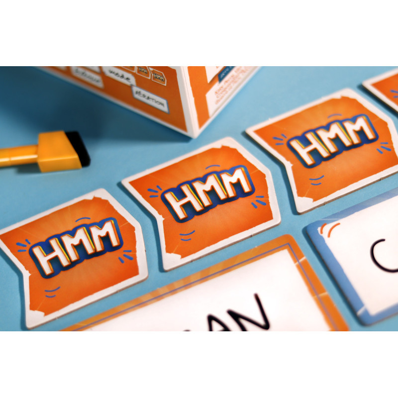 Contenu : 132 cartes Expression, 12 tuiles "Hmm", 10 ardoises, 2 crayons effaçables et 1 règle du jeu