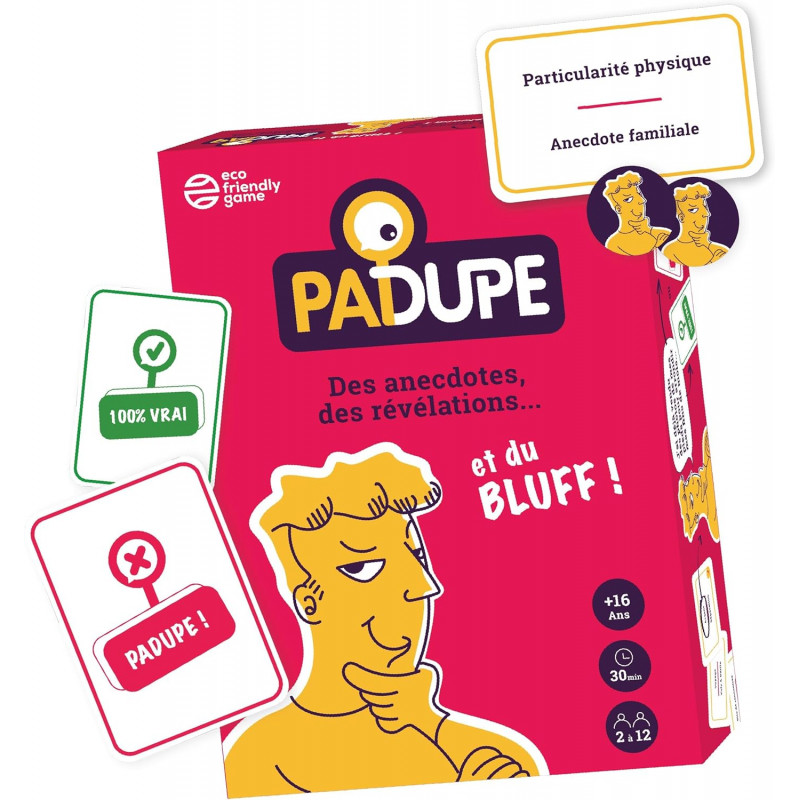 Un jeu d'anecdotes qui résout la principale barrière des jeux d’anecdotes, à savoir le manque d’imagination ou le manque d’envie de raconter des choses sur soi. En effet le Padupe fonctionne même avec les plus timides !
