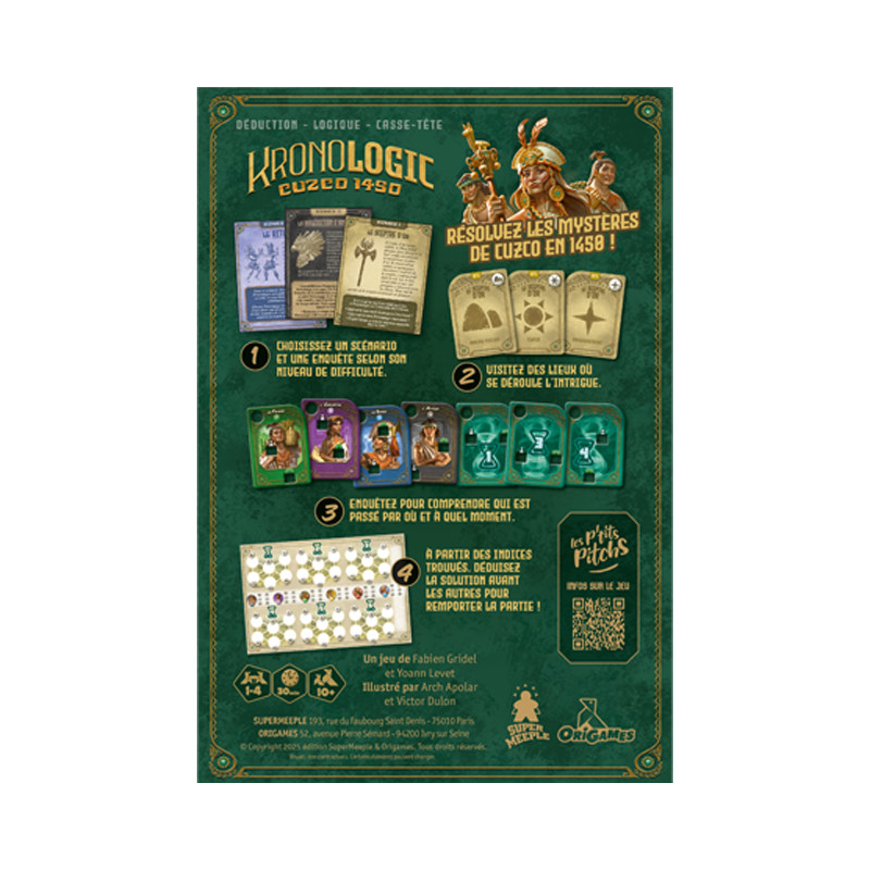 Après le succès de Kronologic – Paris 1920 ; résolvez les enquêtes à Cuzco, en 1450. Enquêtrices, enquêteurs, c’est à vous de démêler une série de mystères inexpliquées qui ont toutes eu lieu à Cuzco, au Pérou. Chacune des enquêtes, à la complexité variable, mettra à l’épreuve votre perspicacité et vos compétences de déduction logique. Qui ? Où ? Quand ? Votre objectif est de résoudre chaque mystère avant les autres, et de rétablir la vérité.