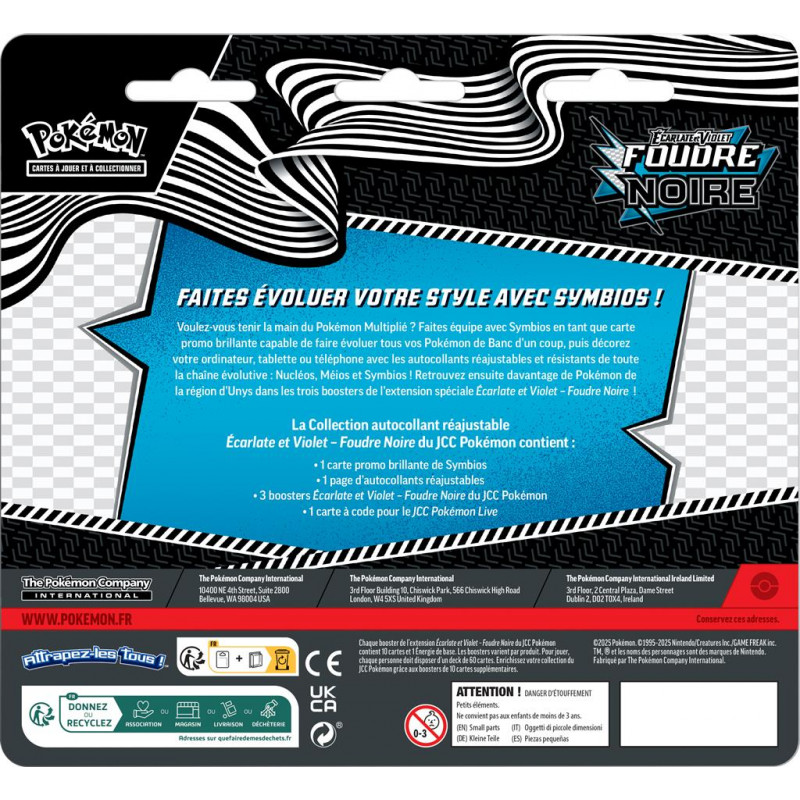 1 carte promo brillante de Symbios, 1 page d'autocollants réajustables, 3 boosters Écarlate et Violet - Foudre Noire du JCC Pokémon, 1 carte à code pour le JCC Pokémon Live