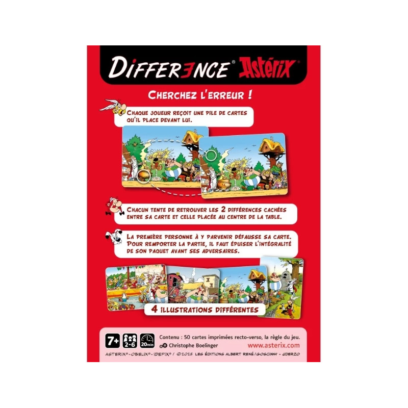 Ouvre grand les yeux, le défi commence ! Dans Différence – Édition Astérix, chaque joueur a une pile de cartes représentant (presque) la même scène. Sauf que deux détails changent. A chaque tour, repère plus vite que les autres ces différences entre ta carte et celle au centre de la table.
