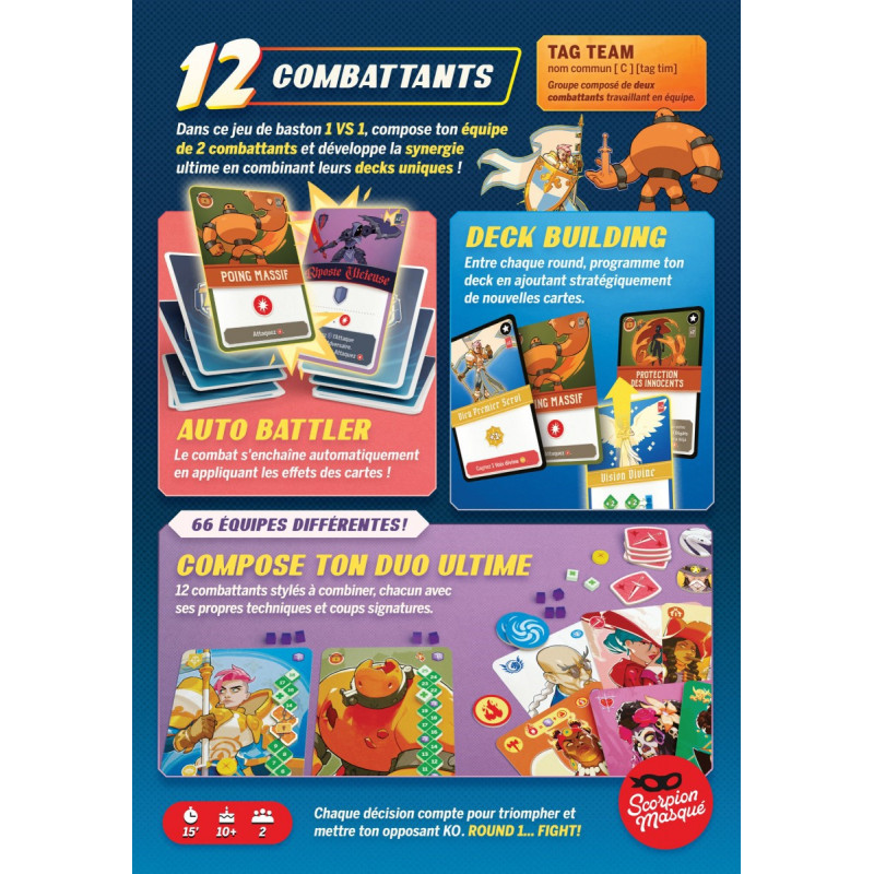 Un nouveau jeu de baston à 2 entre dans l'arène ! Inspiré des meilleurs jeux de combat d’arcade, Tag Team est un auto battler croisé avec du deckbuilding. Composez votre équipe de 2 combattants et développez la synergie ultime ! Chaque personnage a ses propres techniques et coups spéciaux. FIGHT !