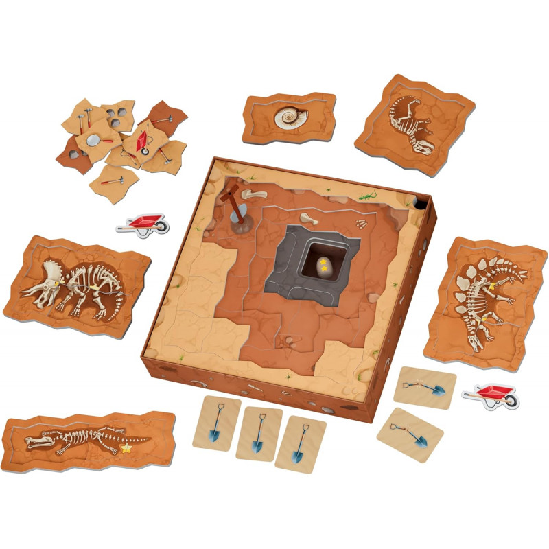 Contenu : 1 terrain de fouilles, 50 tuiles Terrain, 4 tuiles Découverte, 5 plateaux Fossile, une pelle ventouse, 3 œufs en bois, 1 jeton hexagonal, 5 jetons Brouette, 11 cartes, la règle du jeu