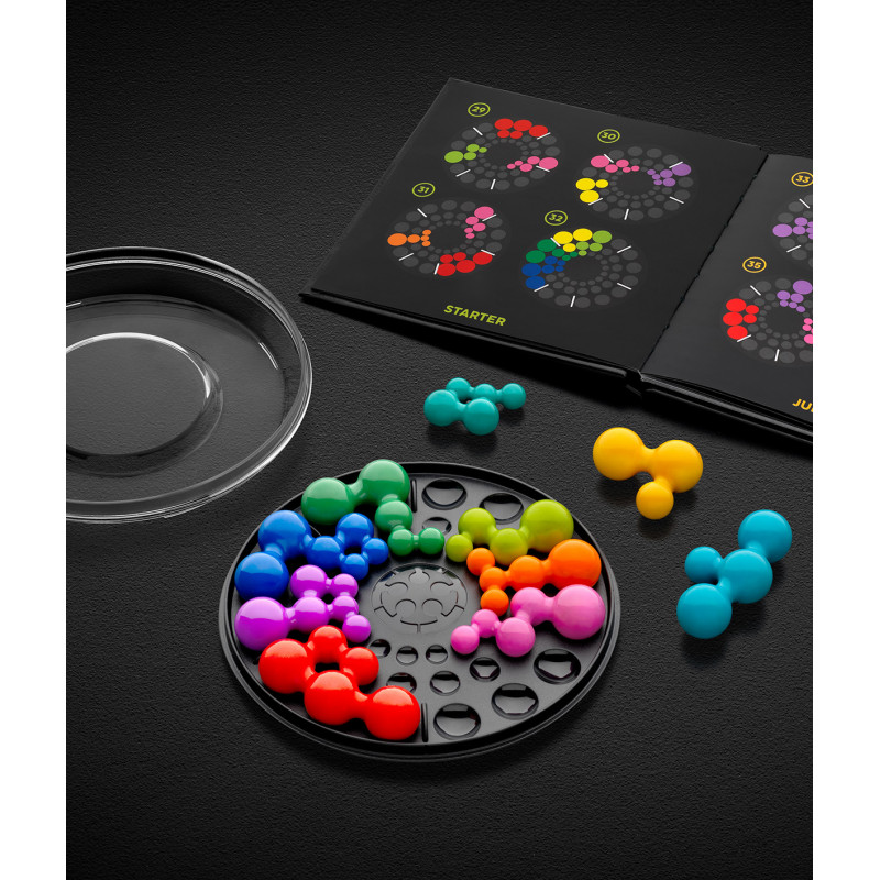 Contenu : 1 plateau rond avec couvercle, 10 pièces, 1 livret comportant 120 défis et leurs solutions, 1 livret de règle