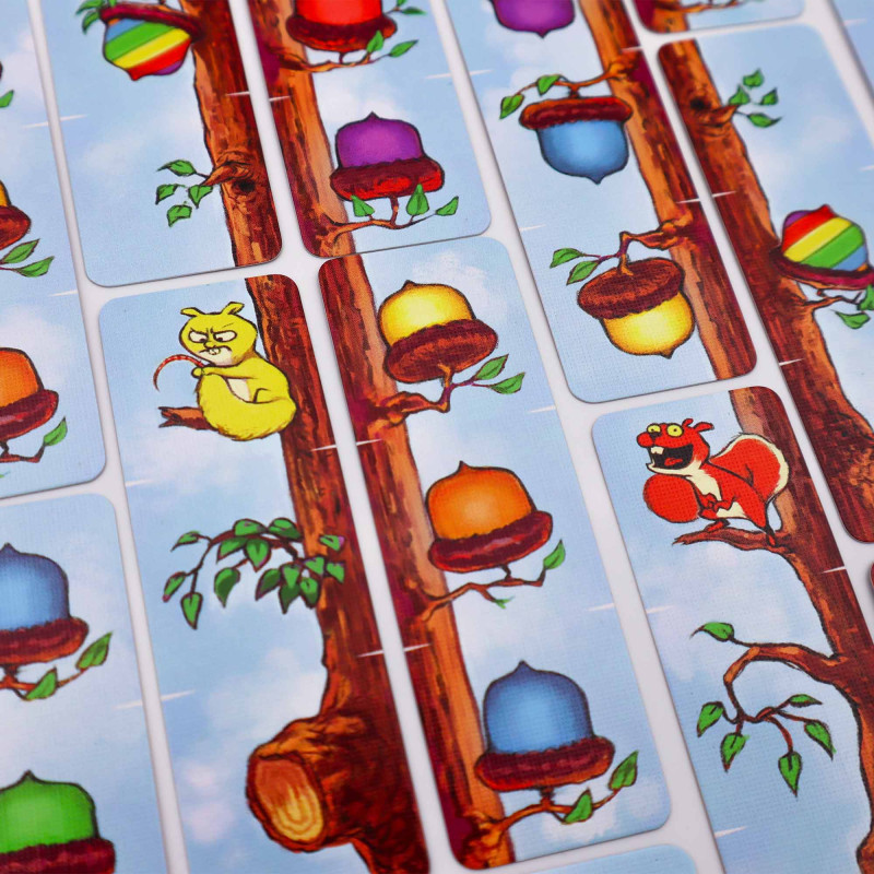 Collectez des glands et stockez-les dans les arbres de votre zone de jeu. Vous ne pouvez compter chaque couleur qu'une seule fois et vous aurez besoin d'écureuils pour multiplier vos ensembles et gagner des points. Ce jeu de cartes de collection de petits ensembles vous rendra fou !