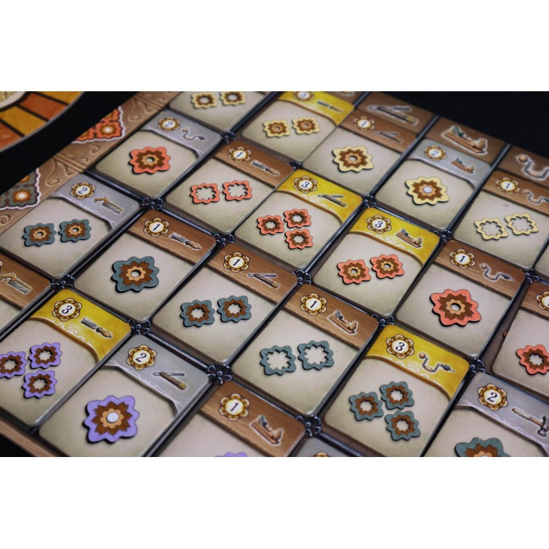 Ces cartes sont la colonne vertébrale du jeu : en effet, les pièces que vous allez poser nécessitent d'être payées avec des cartes correspondant à la couleur du cadre extérieur de votre rosace (la première pièce que vous posez). Quelque soit la pièce que vous posez, le coût sera toujours de une et une seule carte.