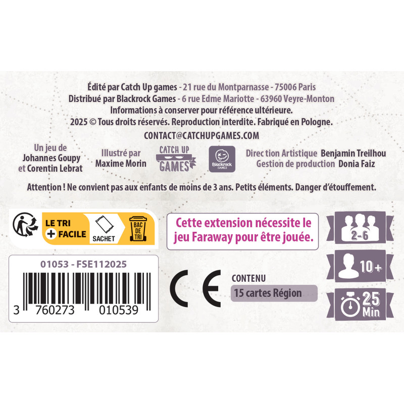 Cette seconde extension pour Faraway ajoute 15 cartes Météorites à la pioche de cartes Région. Particularité : ces cartes restent visibles en fin de partie, et sont ainsi prises en compte dans les conditions de score de n’importe quelle autre carte de votre tableau, y compris celles décomptées avant.