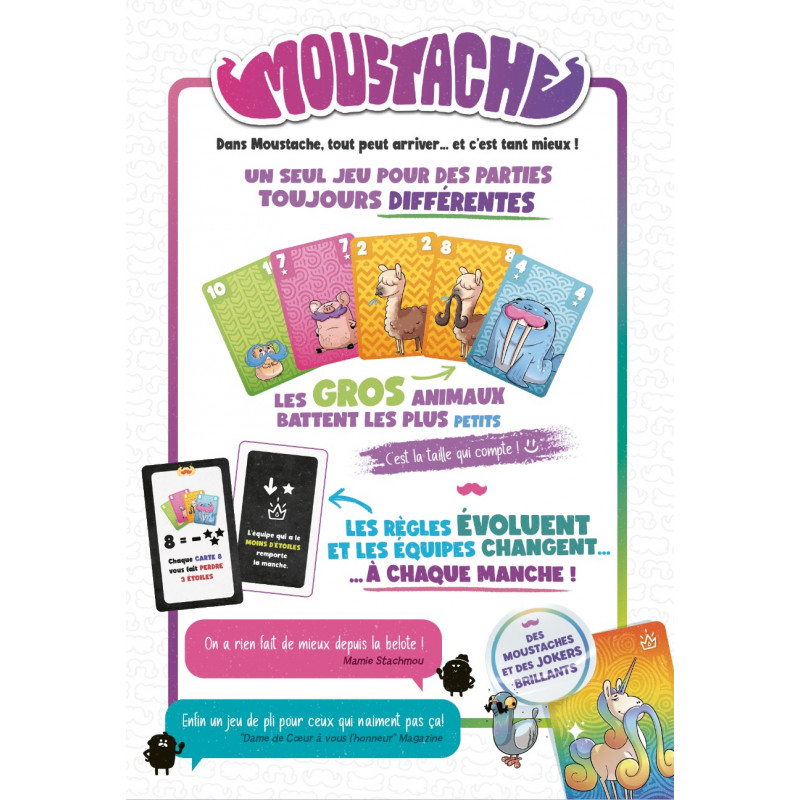 Moustache est un jeu de plis à rebondissements, pour 3 à 6 joueurs. À chaque manche, les équipes sont redéfinies aléatoirement et une nouvelle règle vient chambouler la partie : hiérarchie des couleurs inversée, jokers délirants, effets de cartes...