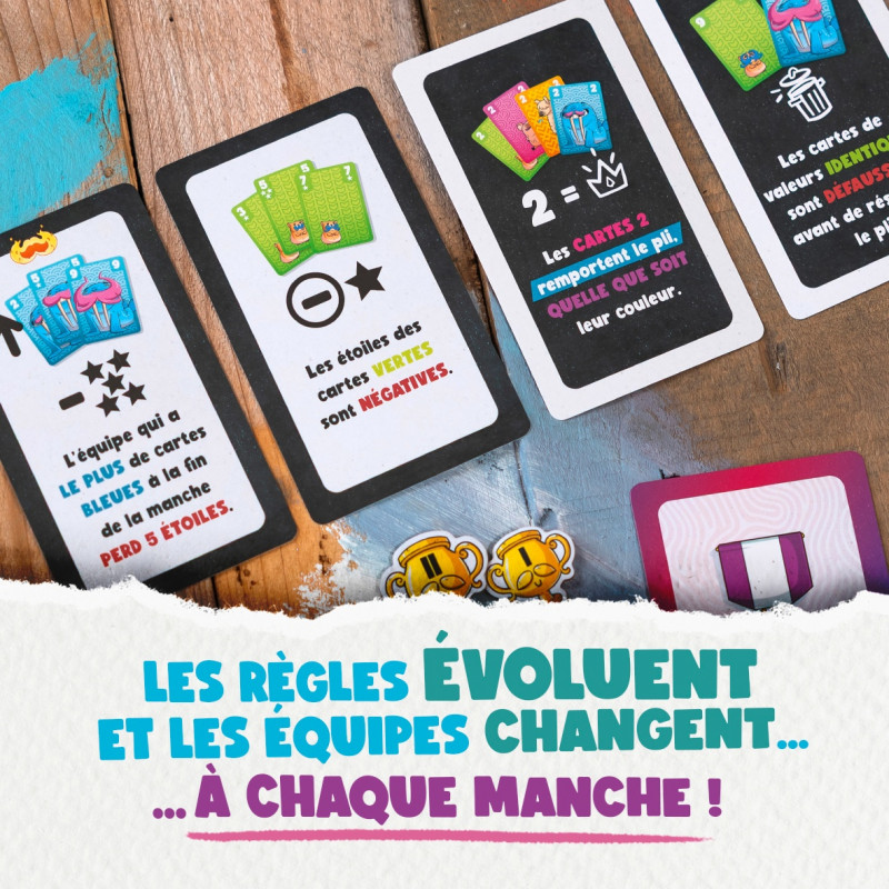 Rien n’est jamais figé ! Grâce à un système de règles évolutives et de cartes Équipe, chaque partie est unique et pousse à l’adaptation constante. On y retrouve le plaisir immédiat du jeu de plis, enrichi d’un goût de chaos contrôlé. Facile à apprendre, drôle à jouer, idéal pour animer une soirée famille ou amis.