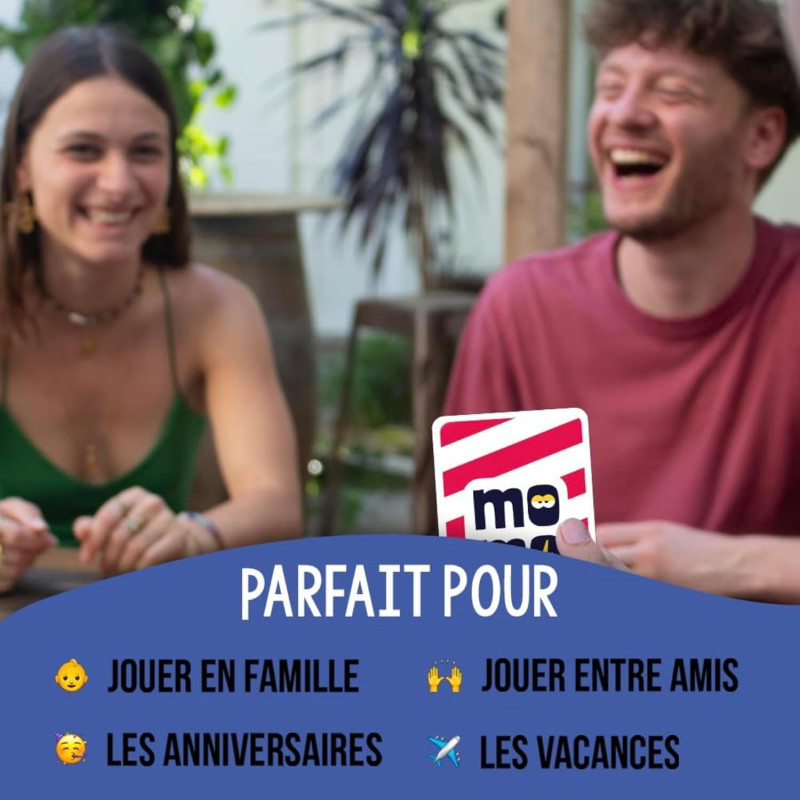 Momo est un jeu de société d’ambiance aussi drôle qu’addictif, pensé pour faire rire tout le monde. Accessible dès 12 ans, il se joue en famille ou entre amis, à l’apéro, en week-end ou en vacances.