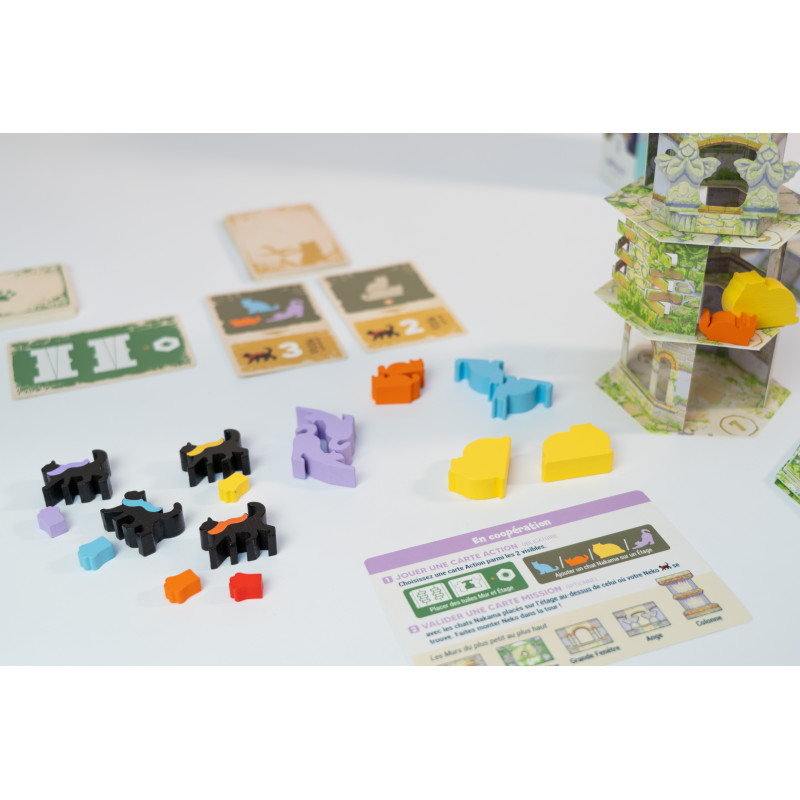 Les joueurs construisent ensemble la tour avec des tuiles Mur et Étage. Des cartes Mission demandent de placer certains chats colorés sur l'étage au-dessus de celui où se trouve Neko (ex. : deux chats de couleurs différentes doivent se toucher).