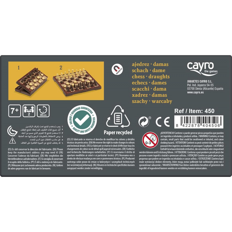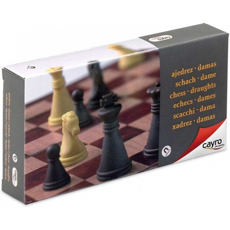 Un échiquier de 24 x 24 x 2 centimètres avec des pièces d'échecs et de dames magnétiques.