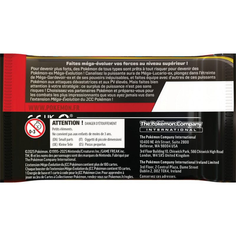 Chaque booster de l'extension Méga-Évolution du JCC Pokémon contient 10 cartes, 1 énergie de base ou 1 carte à code pour le JCC Pokémon Live.