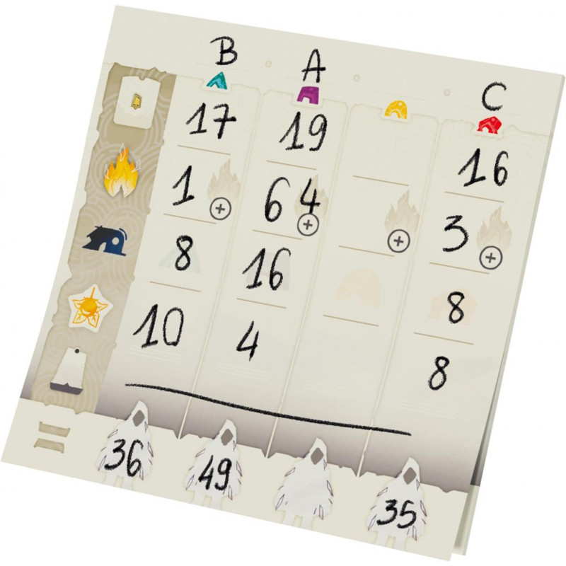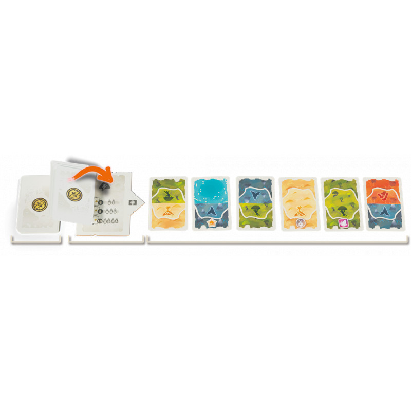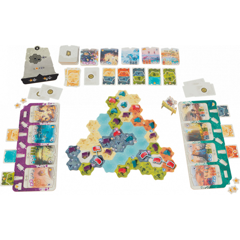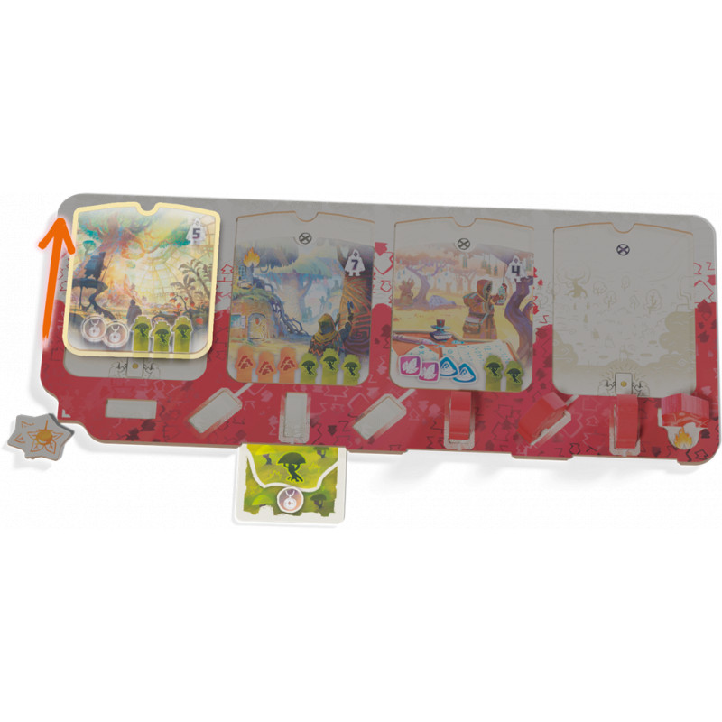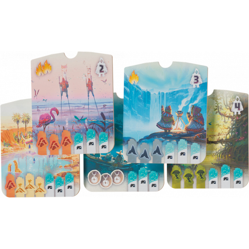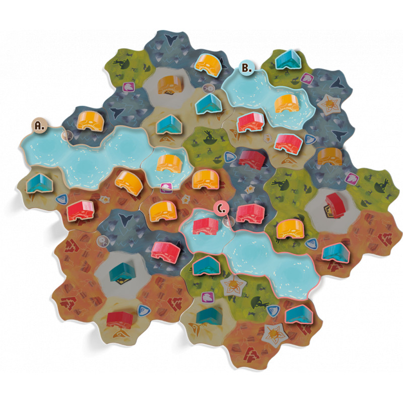Chaque tour, vous devrez choisir entre piocher de précieuses cartes Terrain ou avancer sur la carte. Le moindre mouvement compte : vos camps bloquent, connectent ou ouvrent de nouvelles voies vers la victoire. Grâce à un système de placement malin, des objectifs à valider (tuiles Histoire) pour marquer plus de points et des effets de terrain variés, chaque décision tactique impacte votre score final. En plus de la conquête de territoires, vous devrez maîtriser le feu, récolter des baies et connecter vos camps pour maximiser votre score. Tout en mettant des batons dans les roues de vos adversaires !