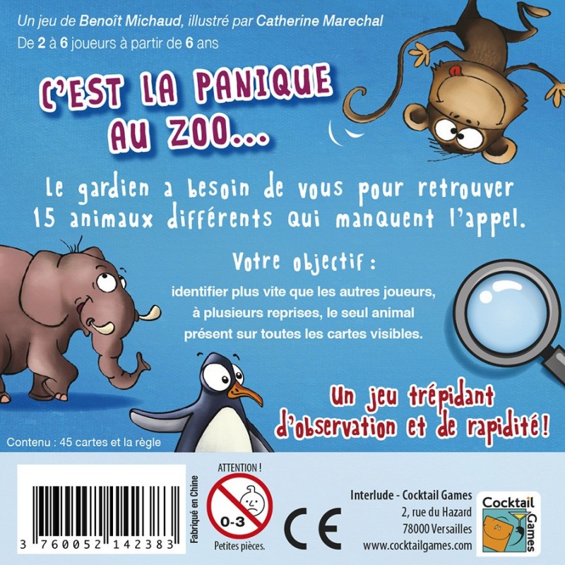 C’est la panique au zoo : le soigneur a besoin de vous, à chaque manche de jeu, pour identifier le seul animal présent sur toutes les cartes. Mais attention, il vous faudra des yeux de lynx car toutes les cartes sont différentes. Observez toutes les bêtes et sauvez vite le zoo !
